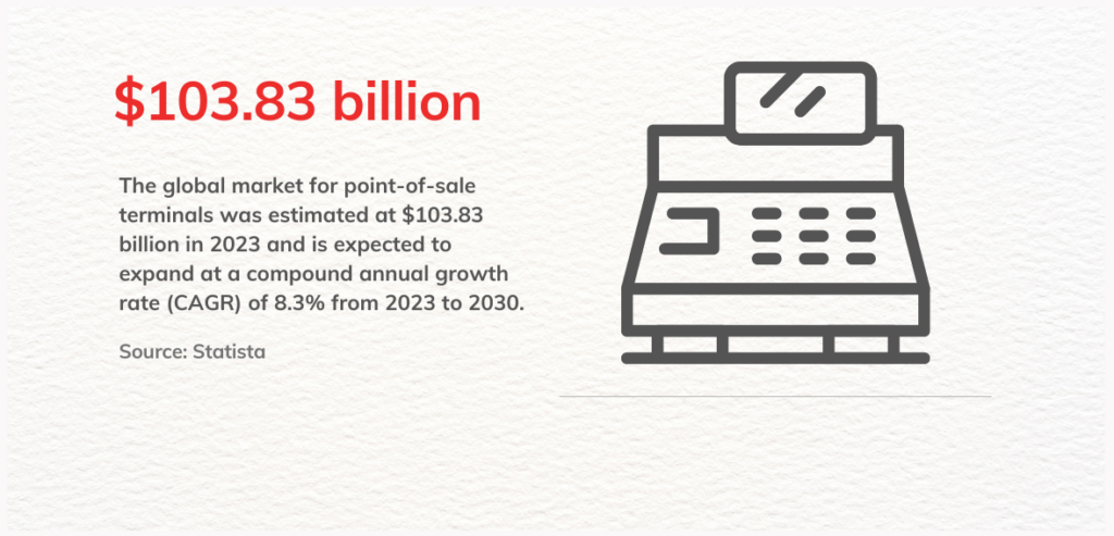 The POS market is large and growing. Globally, the POS hardware (terminals) market is estimated at just over $100 billion in 2024 and is projected to reach about $152 billion by 2029 (around 8.7% CAGR). The POS software segment is also expanding, with a valuation of around $13.7 billion in 2023 and projected to double by 2032. North America is a major driver of this growth; in fact, the region accounted for roughly 36% of the global POS market in 2023.